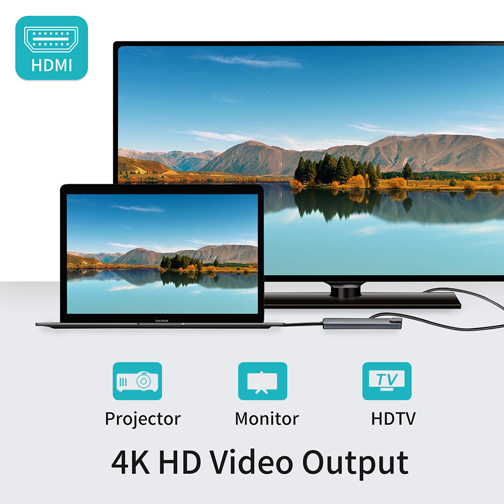 【4K HDMI & PD 100W】USB C Hub with HDMI supports HD displays or projectors with resolutions up to 3840*2160@30Hz(4K), 1920x1080@60Hz(1080P), backward compatible with 1280x1024, 1600x1200, 720p, etc.The USB C hub uses the PD protocol, supporting fast charging up to 100W, and output power is 87W-100W, related to the device.